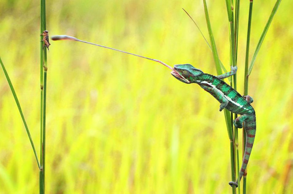 Le caméléon est un maître du déguisement. Il utilise sa faculté à changer de couleur pour se fondre dans le paysage et passer inaperçu aux yeux des proies qu’il capture. Presque immobile, il tourne ses yeux en tous sens jusqu’à ce qu’il ait repéré une proie. Il avance lentement vers elle et déroule sa langue à la vitesse de l’éclair pour encoller sa victime. Entièrement sortie, la langue mesure autant que le corps du reptile. Il est principalement insectivore, le caméléon commun se nourrit de criquets, sauterelles, papillons, araignées, chenilles, coléoptères.
