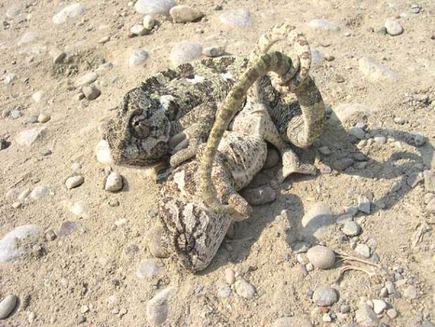 Le caméléon (حرباء en Arabe, تاتا en Darija ) est un reptile diurne et arboricole, il ne descend que rarement à terre. Il vit en solitaire et se montre très territorial sauf au moment de la reproduction.Les caméléons sont les seuls reptiles qui ont particularité d’avoir des yeux indépendants l’un de l’autre, ce qui leur permet de voir dans deux directions différentes en même temps.