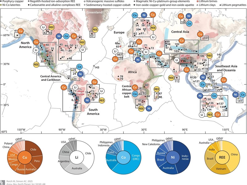 Gisements mondiaux de minéraux critiques Ressources minérales critiques mondiales, illustrant la répartition des provinces riches en gisements de cuivre, nickel, cobalt, lithium et terres rares. Les diagrammes circulaires présentent les pays possédant les plus importantes réserves (US Geological Survey, 2024). Les différents types de gisements sont indiqués dans la légende. Les