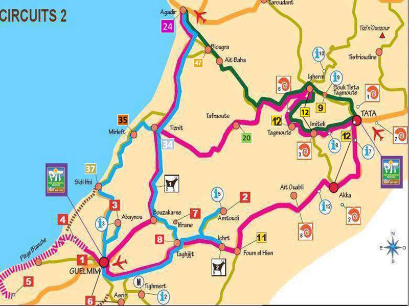 Circuits Sud de l'Anti-Atlas Pour simple Berline : Tiznit - Bou Izakarn - Guelmim - Taghjicht - Icht - Foum El Hisn - Akka - Tata - Issaffen ou Tagmout - Igherm - Tafraout - Tiznit - Agadir Avec 4x4 : Plage Bla