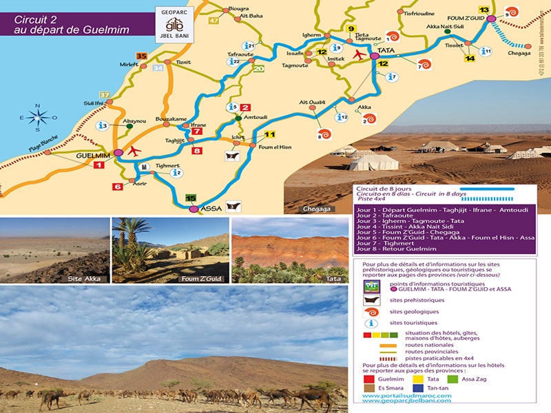 Circuit 8 jours au départ et retour vers Guelmim Circuit de 8 jours Circuito en 8 dias - Circuit in 8 days Piste 4x4 Jour 1 - Départ Guelmim - Taghjijt - Ifrane - Amtoudi Jour 2 - Tafraoute Jour